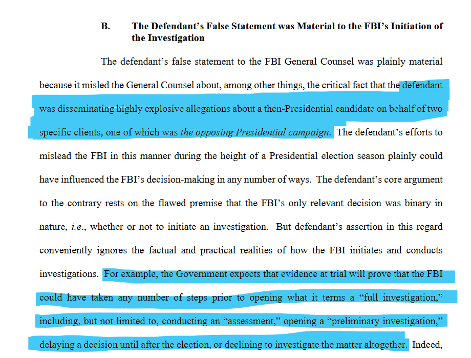 Durham basically arguing that Sussmann's attorneys have had to really twist the definition of materiality to make their weak argument for dismissal.