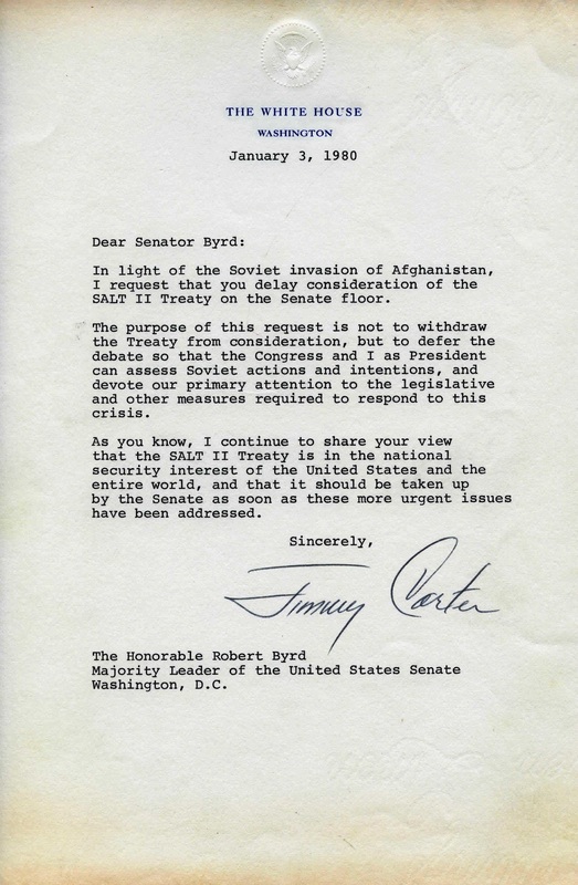 The same day, Carter also withdrew the SALT II agreements—a joint US-USSR proposal to stop making new nukes—from congressional consideration. Here’s the letter Carter sent to Senate Majority Leader Robert Byrd announcing the decision (@ByrdCenter):