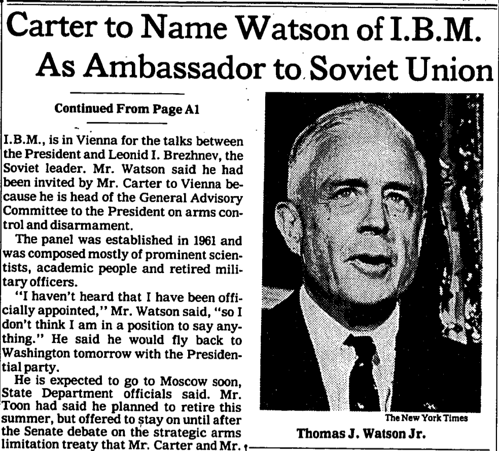 Carter followed up on January 3 by recalling Thomas Watson Jr., the iconic @IBM CEO and U.S. Ambassador to Russia, who had just been appointed in June 1979 (@nytimes, June 18, 1979):