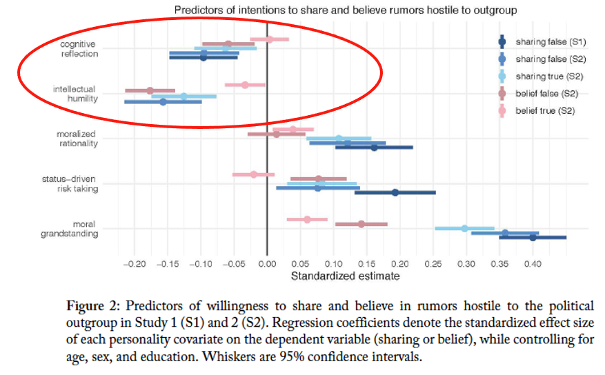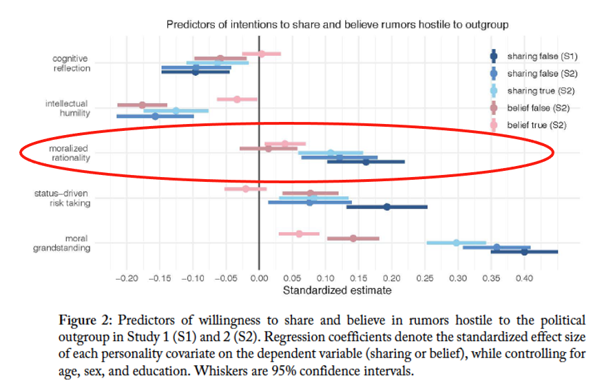 Moralized rationality (measured as here: journals.plos.org/plosone/articl…) *positively* predicts sharing of both true and false hostile news - as well as belief in true hostile news. (6/10)