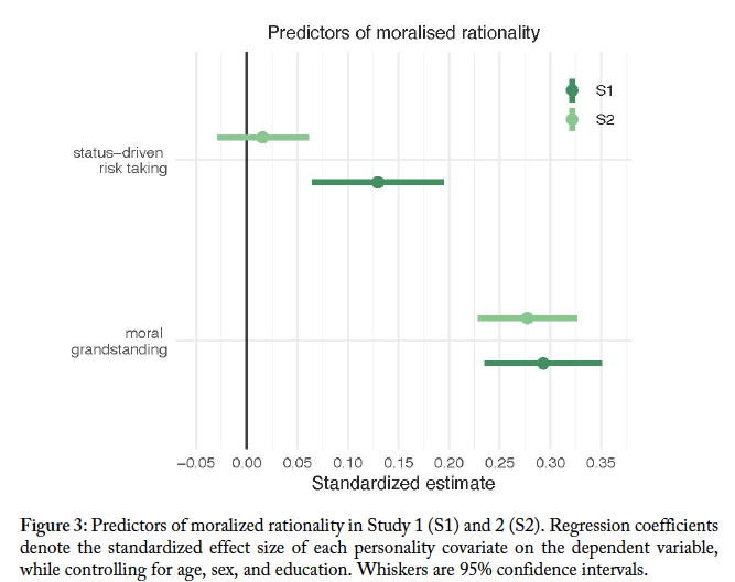 Why? As predicted from the moralization literature, moralized rationality tracks status-traits related to grandstanding, which again predict sharing motivations. ~65 % of the association between moralized rationality & sharing is explained by status-oriented traits. (7/10)