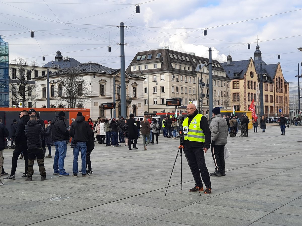 14:43 Auch Michael Brück, ehemals Dortmunder Nazi und jetzt wohnhaft in Chemnitz, ist eingetroffen. Er gehört zu den Freien Sachsen und betreibt deren Telegram-Kanal