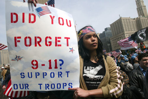 Estadunidenses organizam manifestações de apoio à guerra contra o Iraque. O conflito deixou um saldo de um milhão de mortos — a grande maioria civis — e reduziu o Iraque a um estado de anomia política e disputas incessantes entre facções armadas e grupos terroristas.