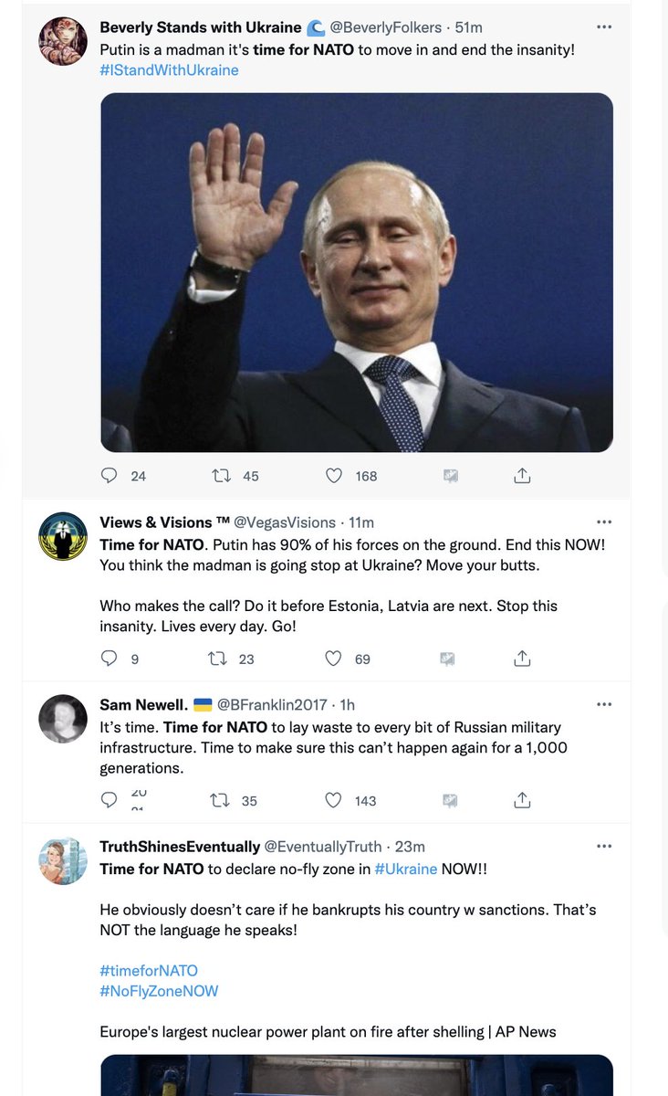 Time for NATO is now trending based on this fake news. From their profiles it appears to be a lot of people who have grifted off of other causes that have caused mass hysteria on social media.