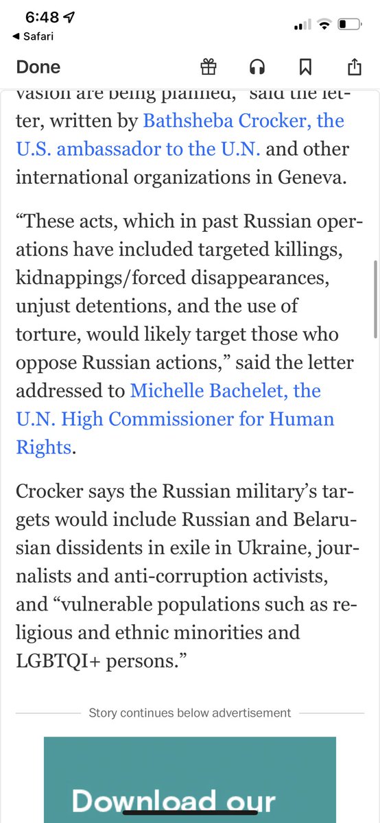 “alleges that Moscow’s post-invasion planning would involve torture, forced disappearances and ‘widespread human suffering.’ It does not describe the nature of the intelligence.” So they’re planning “disappearances” and “suffering”? Sounds credible. washingtonpost.com/national-secur…