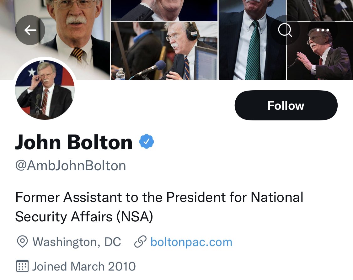 The comedy by @AmbJohnBolton is quite something: The only thing in his Twitter Bio is a job given to him by a person who Bolton claims was incompetent as POTUS.