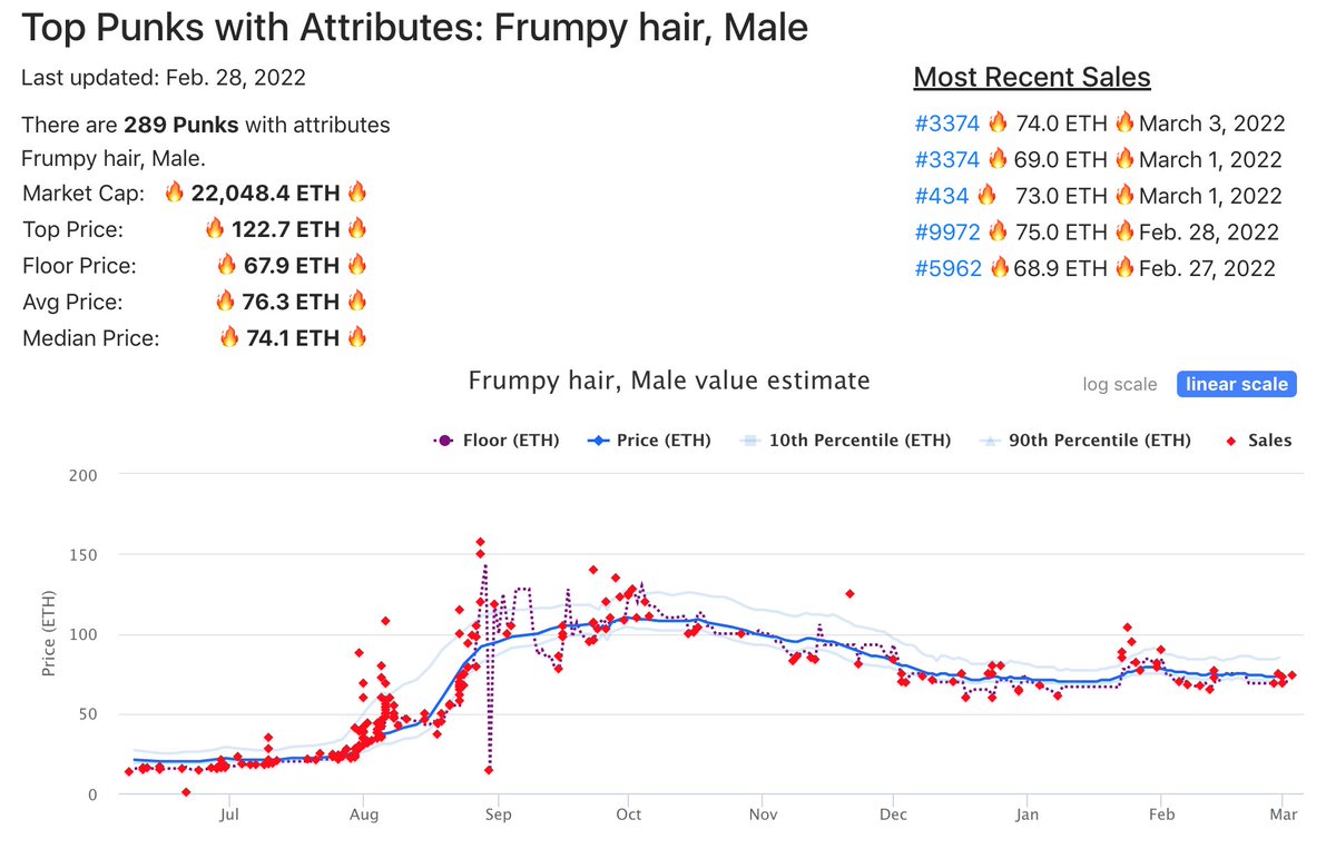 There has been news, ups and downs, floor sweeps, FUD, and big-ish moves in the ETH:USD price. And yet, if you smooth it out even a little, prices have remained steady at around 69 ETH for entry-level Punks since December.