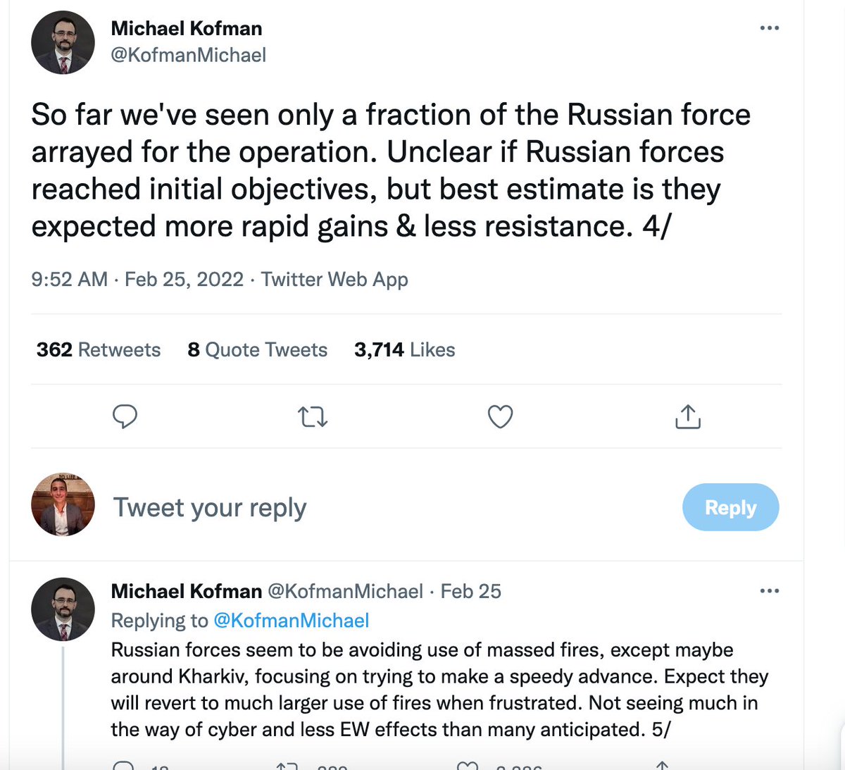 Here's a top US expert on the Russian military noting that Russia has used a "only a fraction" of its operational forces; is "avoiding use of mass fires"; and hasn't deployed cyber-warfare, e.g. shutting down Ukraine's internet and phones. I fear that this won't last.