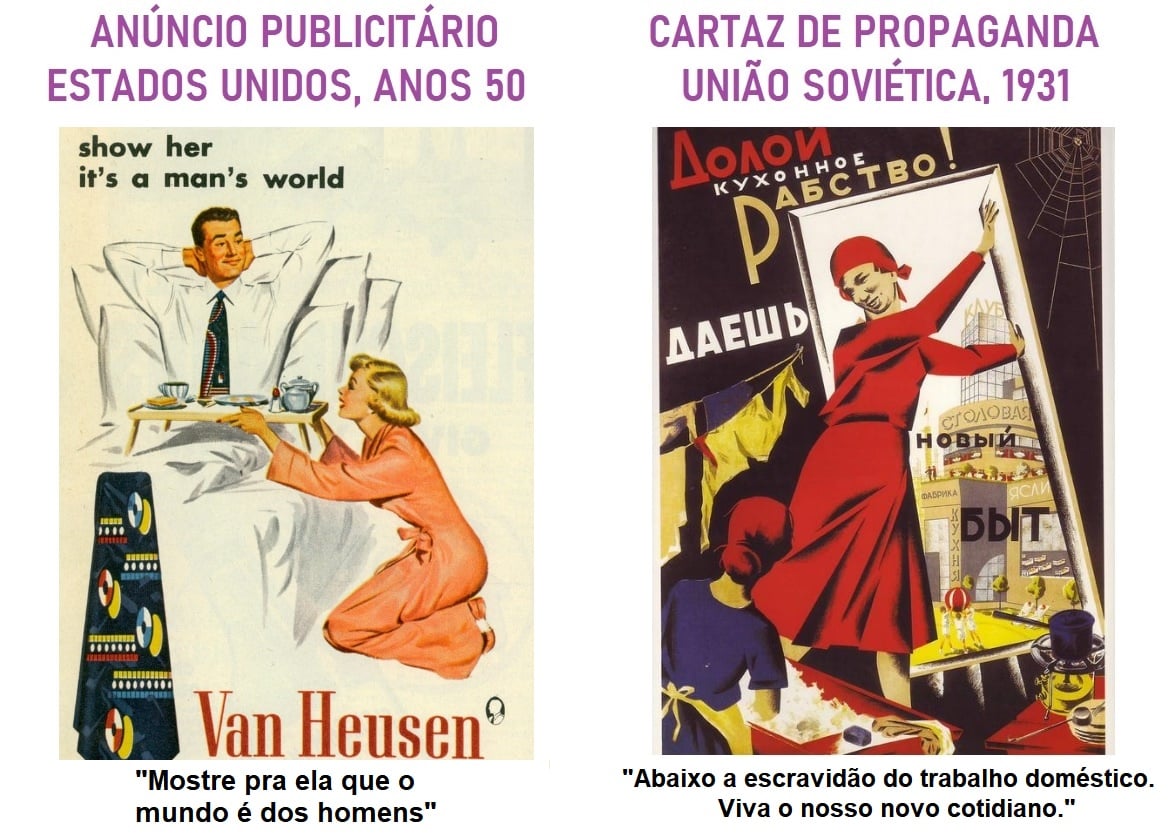 "Abaixo a escravidão da cozinha! Viva a nova vida cotidiana!". O cartaz soviético de 1931 faz referência à socialização das tarefas domésticas. A personagem aponta para as novidades: clube recreativo para trabalhadores, uma cantina comunitária e uma creche estatal.