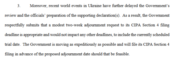 In addition to classified information the government would like to use, there are classified declarations from US intel officials but still awaiting discovery completion.