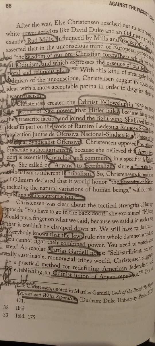 "Christensen creó los Seguidores de Odín bajo la creencia de que Holter perdió porque destruyó la facción strasserista y se unió a la derecha, alabó la obra de Ledesma y se opuso al franquismo porque creía que la libertad aria es esencialm. anarquista y comunal en forma folkish"