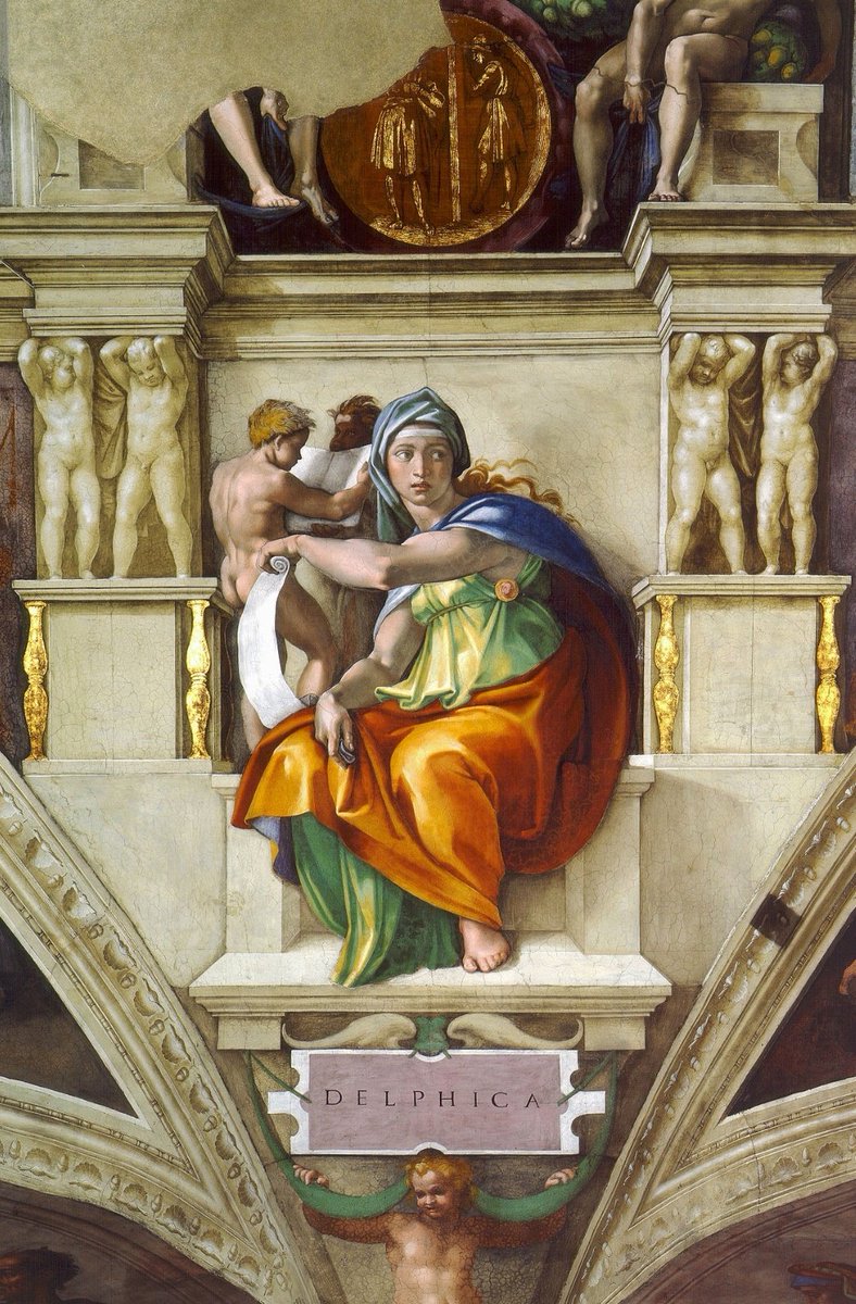 Cuando entras en la capilla ves las paredes con pinturas de Moisés y Cristo de otros pintores y de repente levantas la cabeza para mirar el techo y te encuentras con figuras enormes de los profetas del Antiguo Testamento alternadas con Sibilas paganas, profetisas.