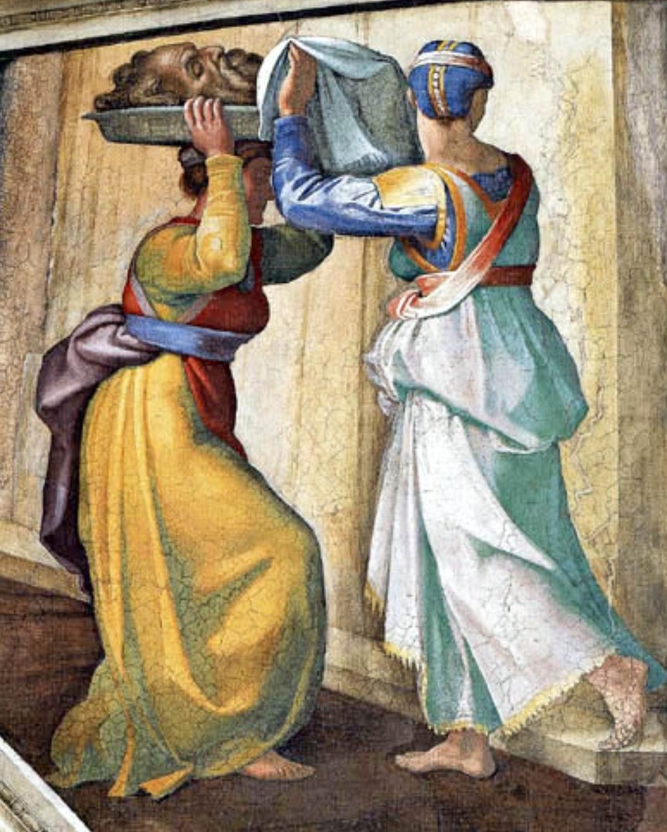 Miguel Ángel divide la bóveda en comparimentos pintando en las cuatro esquinas escenas del Antiguo Testamento que narran la salvación del pueblo judío, como por ejemplo 'Judith y Holofernes'.