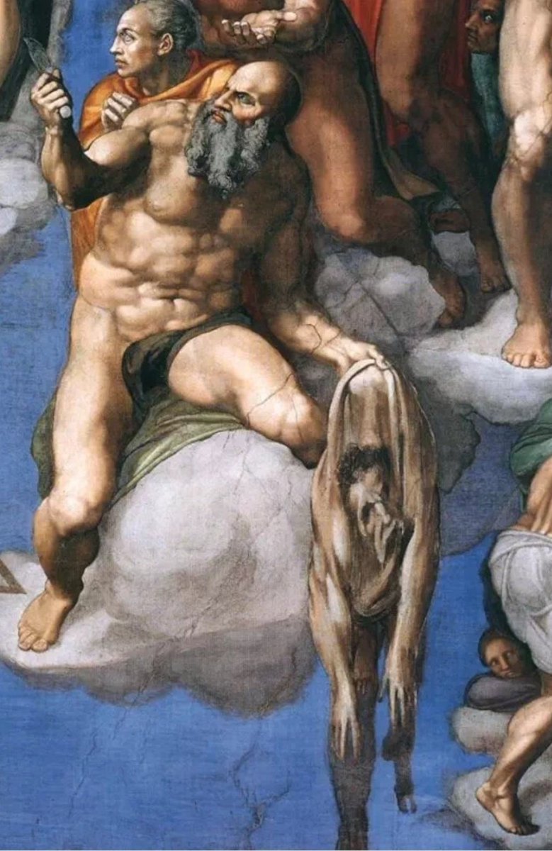 Miguel Ángel se vengó de él haciéndole una caricatura en el infierno, como si fuese Minos, desnudo con orejas de burro y una serpiente enroscada en su cuerpo y otra mordiéndole los genitales.