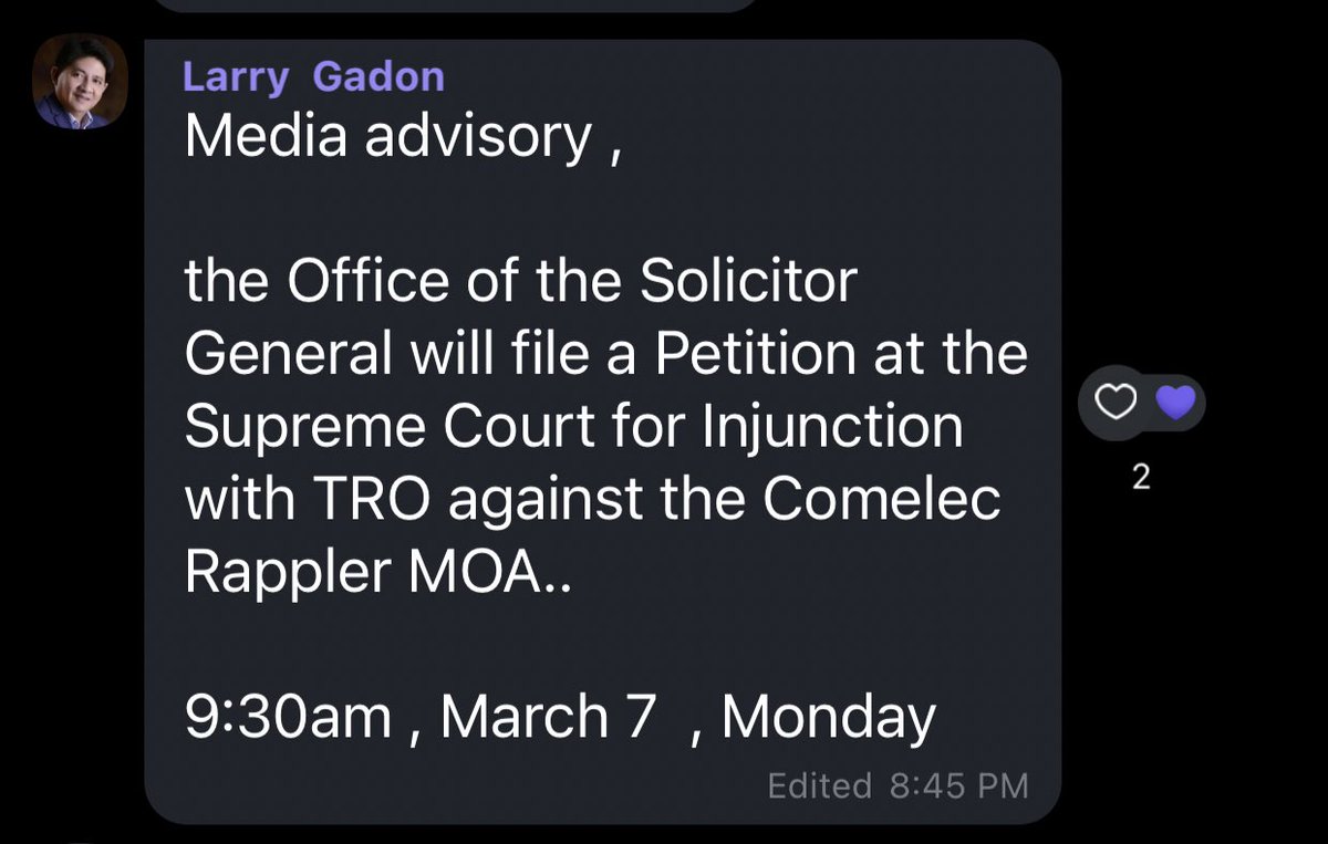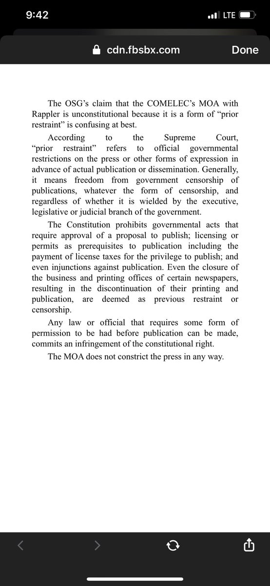 We haven't seen the petition but according to the press statement, OSG argued the fact checking deal constituted the unconstitutional prior restraint on free speech. This is unchartered territory, using the press' favorite defense against the press.