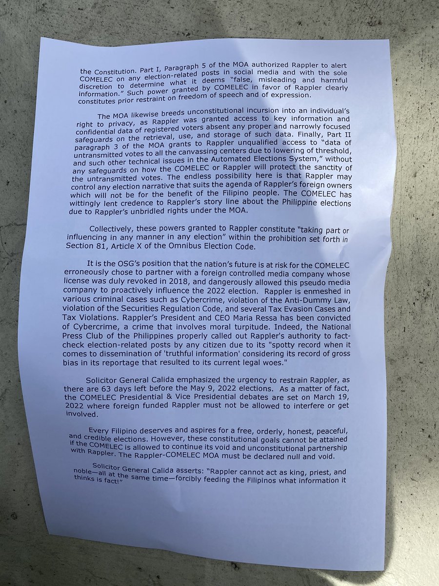 JUST IN: Office of the Solicitor General files a petition with the Supreme Court asking to rescind Rappler's fact checking agreement with Comelec. But SolGen Jose Calida aren't here, neither are lawyers, they sent admin staff to file @rapplerdotcom