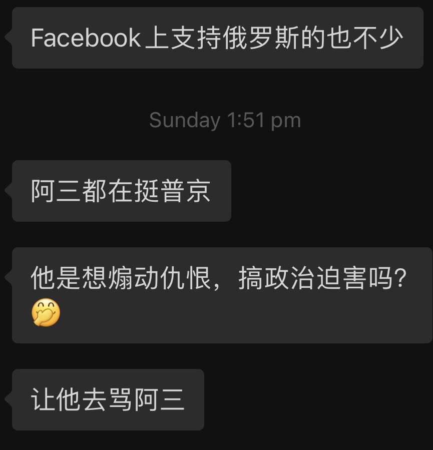 A pro-Russia dude claims that the many Chinese Australians he knows all share his view, not my pro-Ukrainian view. He thinks it’s understandable for me to be pro-Ukraine if I were born in Australia, but not if I came from China.