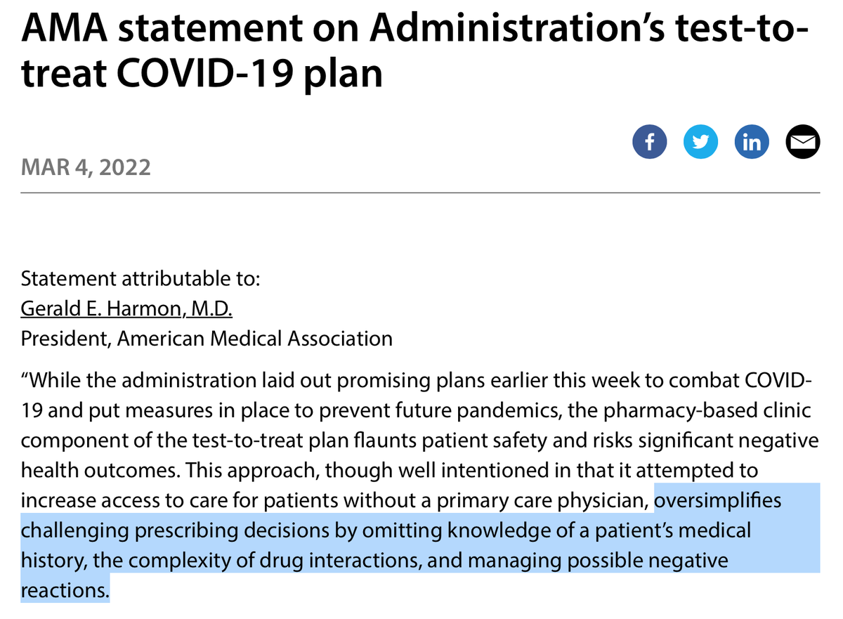 Not a big fan of test-to-treat. It just codifies what HCWs should do anyway. Plus it gives in to expensive pills and gives up on the more efficacious vaccines.