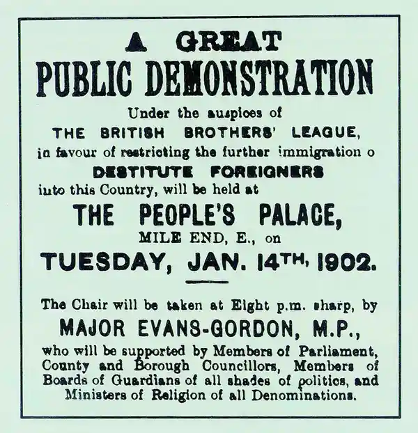 Nevertheless, anti-immigration groups such as the British Brothers league were able to organise 4000-strong meetings in East London. People like W. Wilkins, Arnold White or Major William Evans-Gordon talk of an "Alien Invasion".
