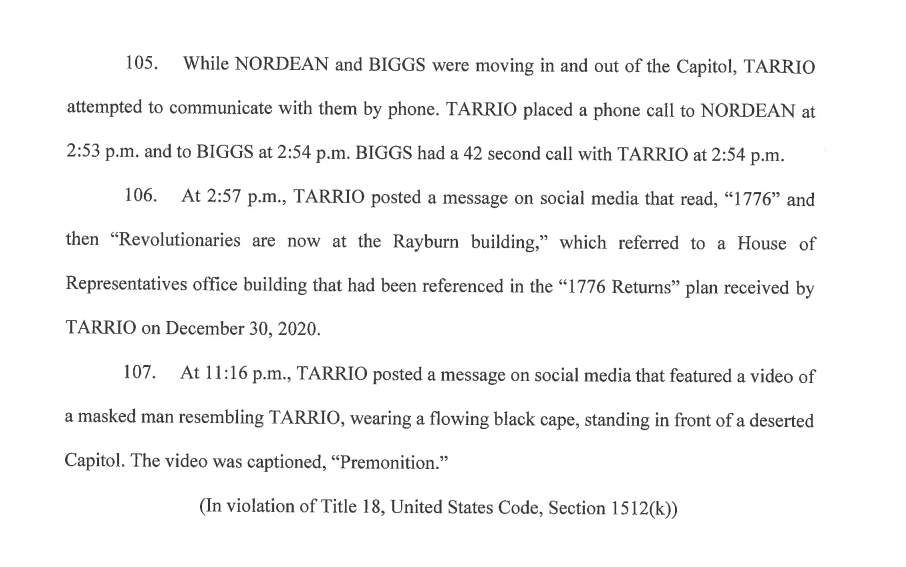 This is new as well. Prosecutors say Enrique Tarrio spoke with Joe Biggs while he and other Proud Boys were in the Capitol on Jan. 6. Tarrio also appeared to reference the "1776 Returns" plan on social media.