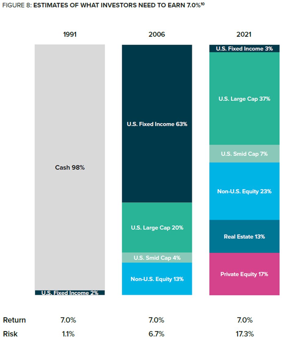 9/ As a result of falling expected returns on traditional assets, investors have been required to allocate an increasing portion of their portfolio to less liquid private market alternative assets, while taking on greater volatility, to maintain a 7.0% expected return.