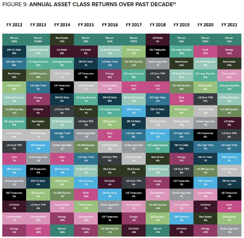10/ Here we rank major asset classes by % return each of the last 10 years. Crypto (represented by #Bitcoin) is #1 for 8 of them. We believe it could further meet the challenges of this macro environment by serving as a risk-on asset and hedge against inflation.