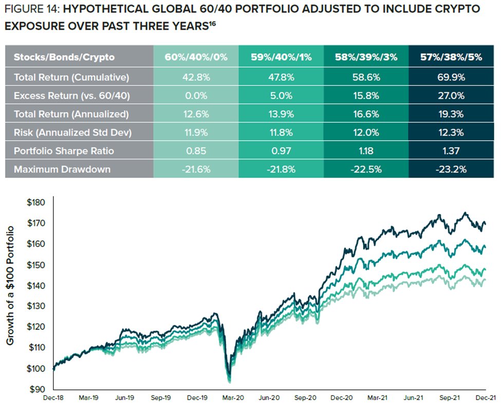 14/ Combining a Global 60/40 Stock & Bond portfolio with crypto exposure over the last three years would have resulted in modestly higher volatility and maximum drawdowns, but with higher risk-adjusted returns than the Global 60/40 Portfolio alone.