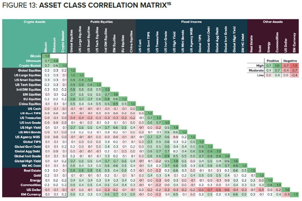 13/ Crypto assets have had low correlations with global asset classes and moderate correlations with other crypto assets, giving them an attractive portfolio diversification benefit. Here we compare #Bitcoin, #Ethereum and a diversified basket vs. traditional asset classes.