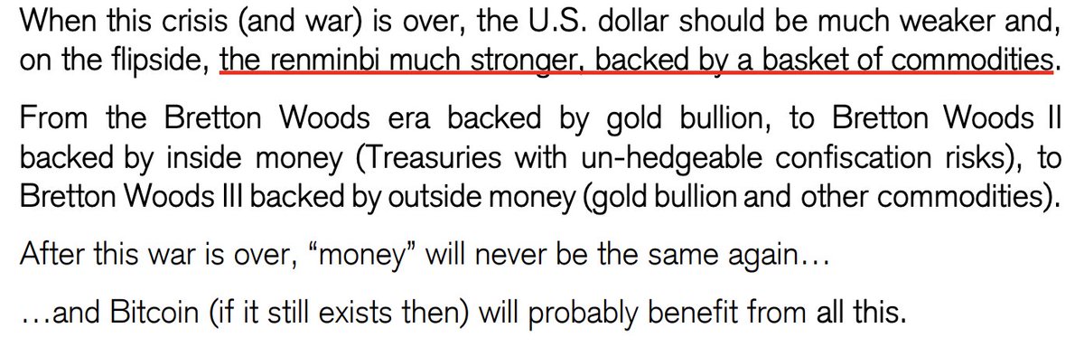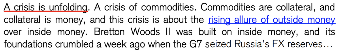 The previous monetary regime, which he calls Bretton Woods II, is OVER. Dead. Finito. It died when the US and its allies seized Russian Central Bank assets, ending the period of CB immunity. Never again will Central Banks be "Made Men" (in the Cosa Nostra way)