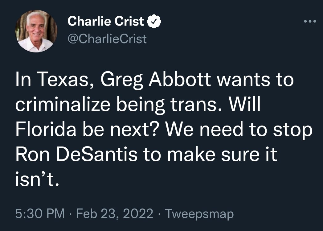 Here's Charlie Crist saying "criminalize being trans". He knows that has no basis in reality, but it doesnt matter. B/c he also knows he's speaking to a group of petulant adult-children who huff emotion like paint and need their fix whether its true or not.
