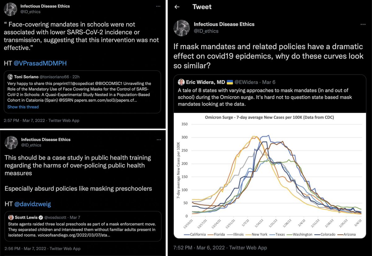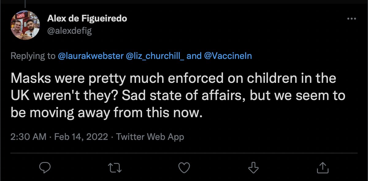 - Thinks masks ‘forced’ on children = ‘sad state of affairs’ and wearing masks = 'suffering'