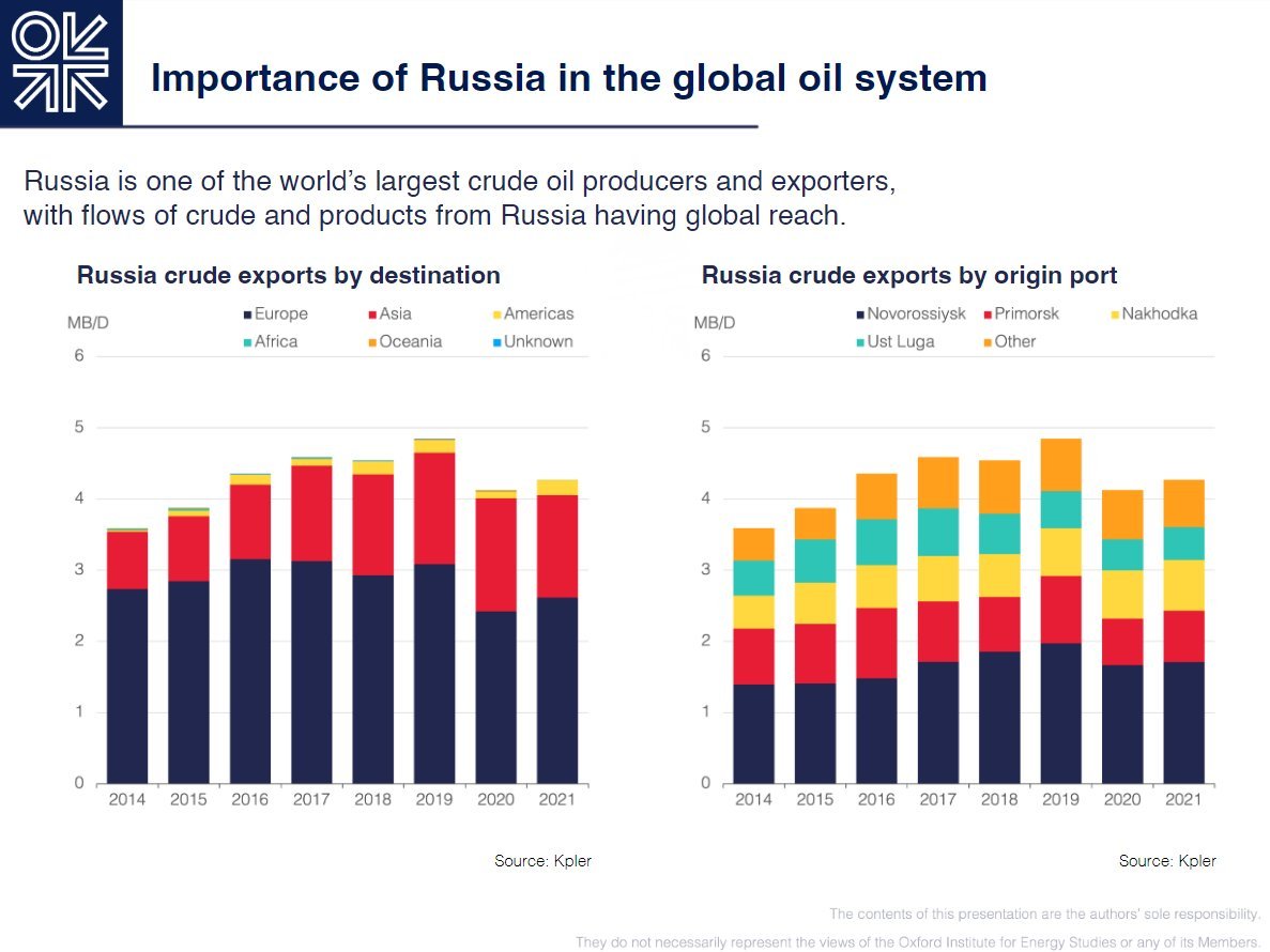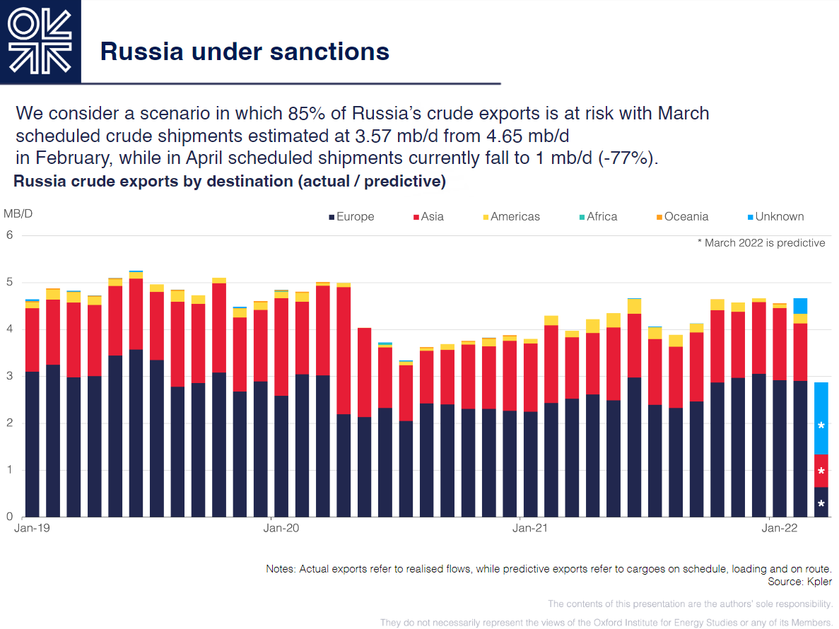 Oxford Institute for Energy Studiesによる、ロシア産原油輸出量が減少・停止した際のケースシナリオ