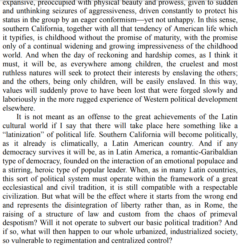 It is not meant as an offense to the great achievements of the Latin cultural world if I say that there will take place here something like a “latinization” of political life. Southern California will become politically, as it already is climatically, a Latin American country