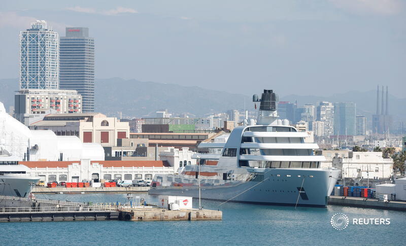 A superyacht linked to Russian oligarch Roman Abramovich left Barcelona where it had been undergoing repairs in a local shipyard, ship-tracking data showed reut.rs/374EF4E