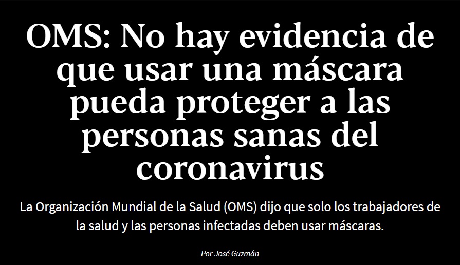 la Salud señaló que: Actualmente, no hay pruebas de que el uso de mascarillas (ya sean médicas o de otro tipo) por parte de personas sanas en el entorno comunitario más amplio, 19.web.archive.org/web/2020042800…