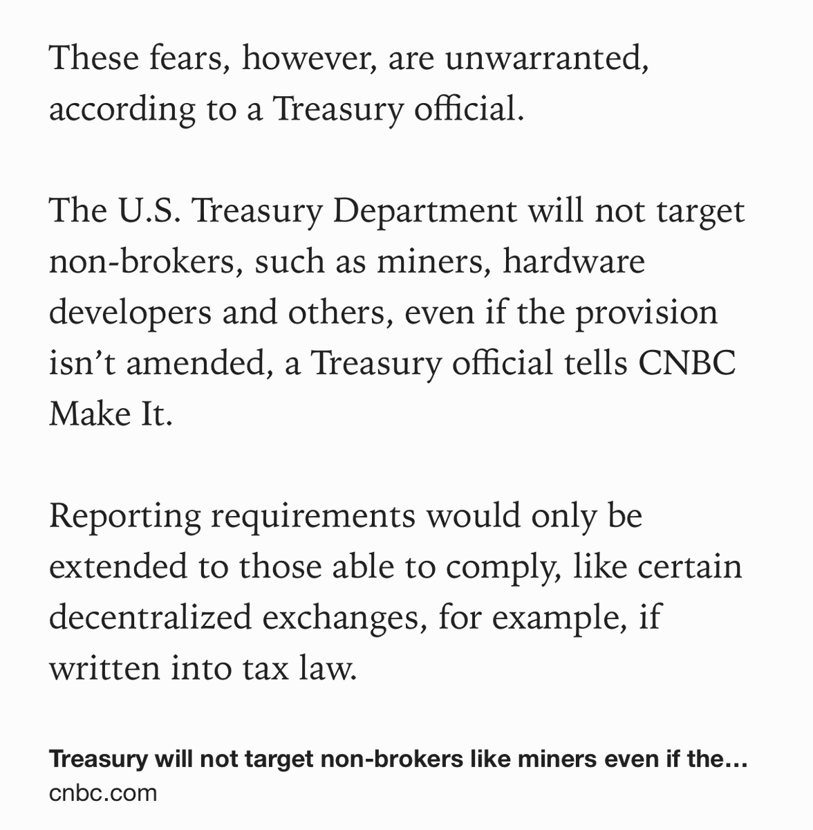 1/ I'm glad to hear that Treasury officials are telling reporters on background that they don't intend to target miners if the infrastructure bill's crypto tax provision becomes law, but I'm afraid that is little comfort. Let me explain. cnbc.com/2021/08/24/tre…