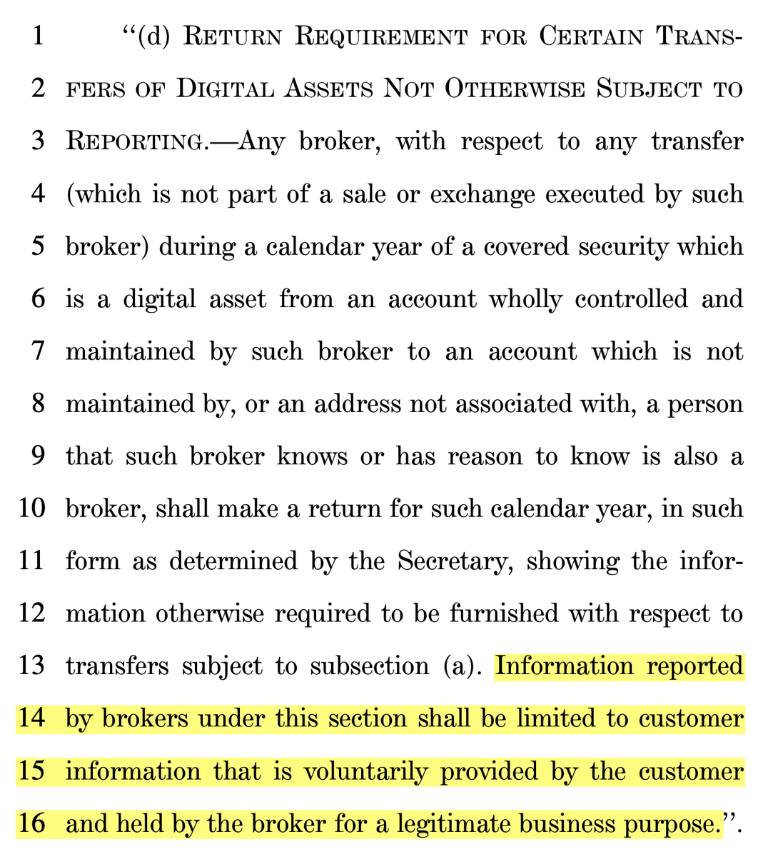 Second, it would limit the new requirement that brokers report mere *transfers* of cryptocurrency by making sure that only information that's voluntarily provided by customers and held for a legitimate business purposes can be shared, as the 'third-party doctrine' requires.