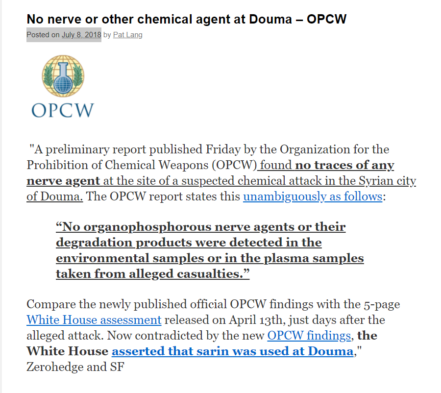 "A preliminary report published Friday by the Organization for the Prohibition of Chemical Weapons (OPCW) found no traces of any nerve agent at the site of a suspected chemical attack in the Syrian city of Douma." turcopolier.com/httpssouthfron…