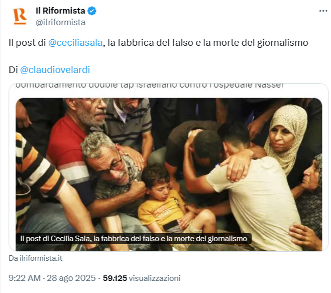 3/ Il 28 agosto 2025 @ilriformista pubblica un articolo a firma di @claudiovelardi dal titolo "Il post di Cecilia Sala, la fabbrica del falso e la morte del giornalismo". Nell'articolo si afferma che Sala avrebbe diffuso un falso generato dall'AI.
