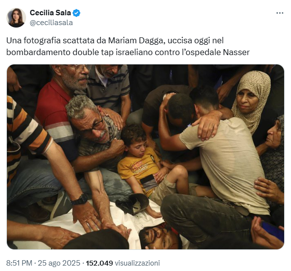 2/ La foto è stata condivisa da @ceciliasala con questo commento: "Una fotografia scattata da Mariam Dagga, uccisa oggi nel bombardamento double tap israeliano contro l’ospedale Nasser".
