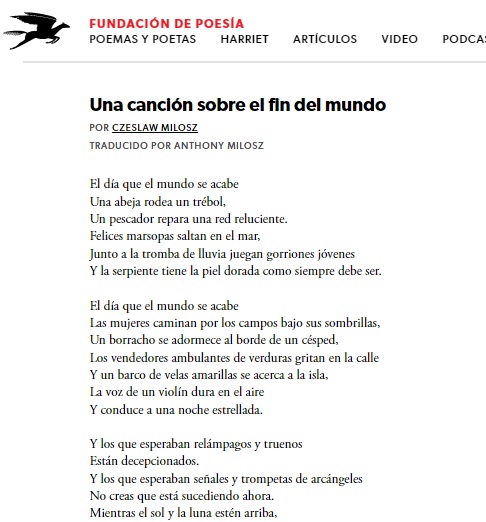 no creen que esté sucediendo ahora. Mientras el sol y la luna estén arriba, mientras el abejorro visite una rosa, mientras nazcan niños rosados, nadie cree que está sucediendo ahora… No habrá otro fin del mundo poetryfoundation.org/poems/49451/a-…