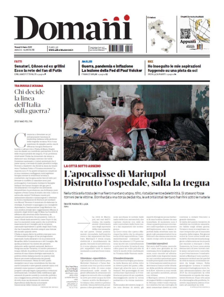 Oggi ci sarà il sesto tentativo di evacuazione dalla città di Mariupol assediata. Alla situazione in città oggi avevamo dedicato la prima pagina (qui il nostro articolo editorialedomani.it/economia/dati/…)