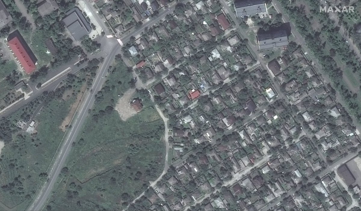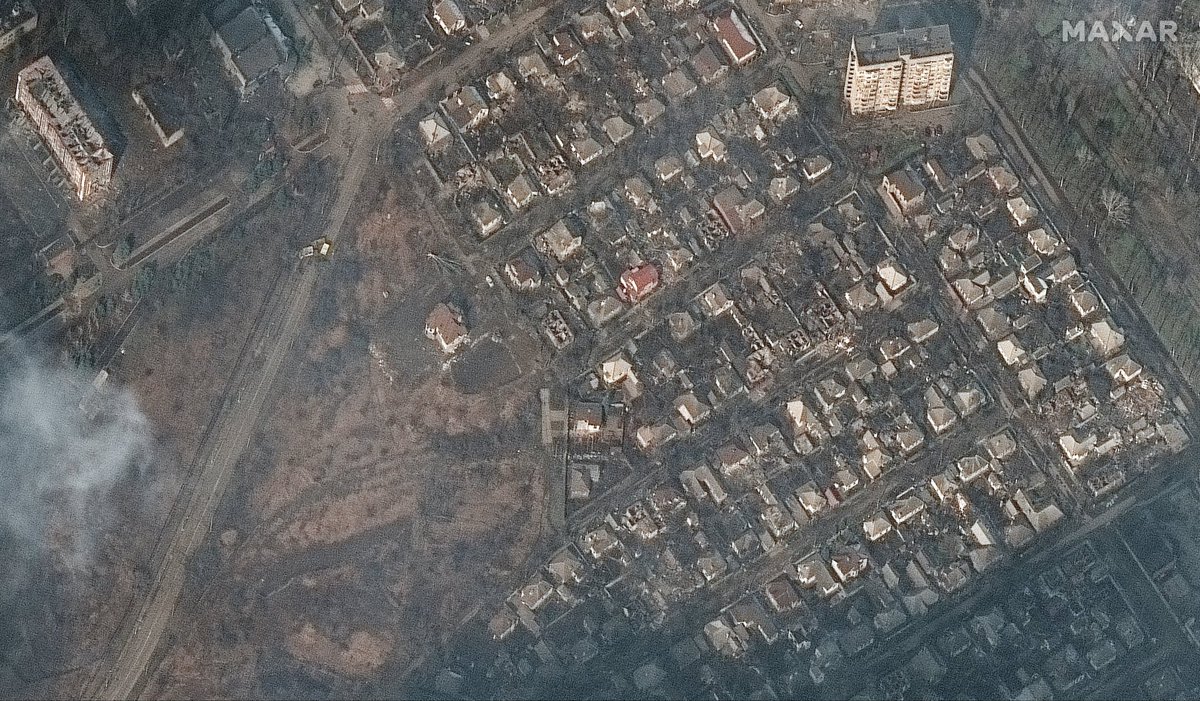 Immagini satellitari Maxar che mostrano la distruzione di un quartiere a Mariupol. Da notare i tetti scoperchiati nel palazzo a sinistra e i numere case al centro della foto (