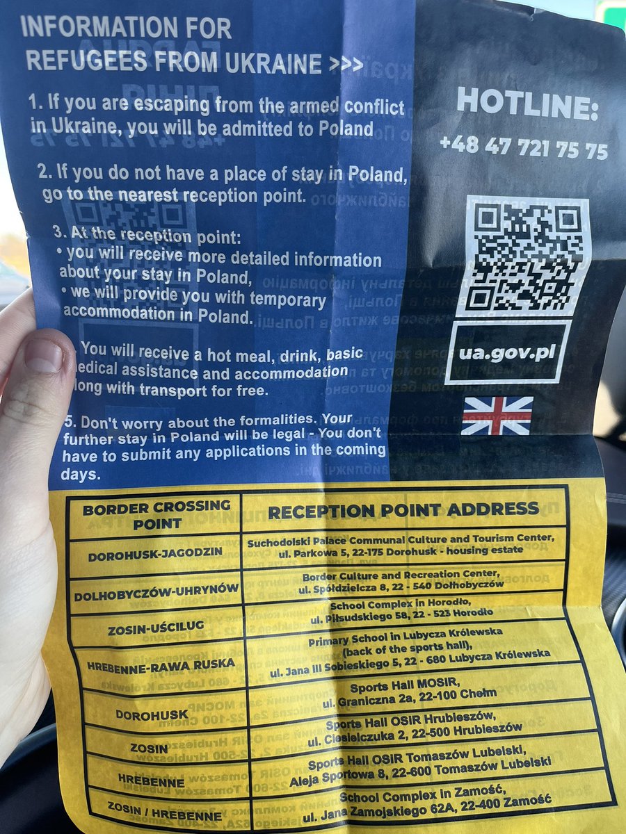 This leaflet is given out by the authorities at Zosin crossing to 🇺🇦 arrivals: “You will receive a hot meal, drink and accommodation…don’t worry about the formalities. Your further stay in Poland will be legal. You don’t have to submit any applications in the coming days.”