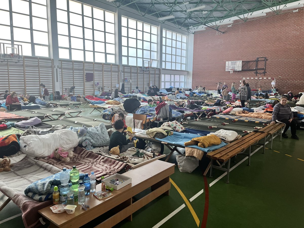 Eastern Poland’s transformation into one huge refugee corridor continues. Normally this gym is part of a technical college in Zamość, about an hour from Lublin. As it is this section of the building has been sectioned off completely to become a rest centre.