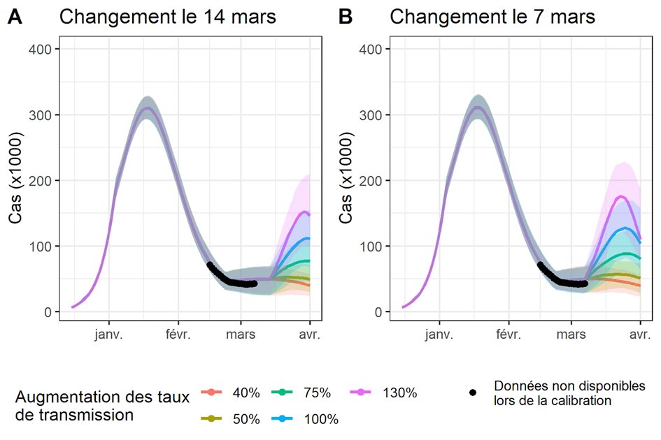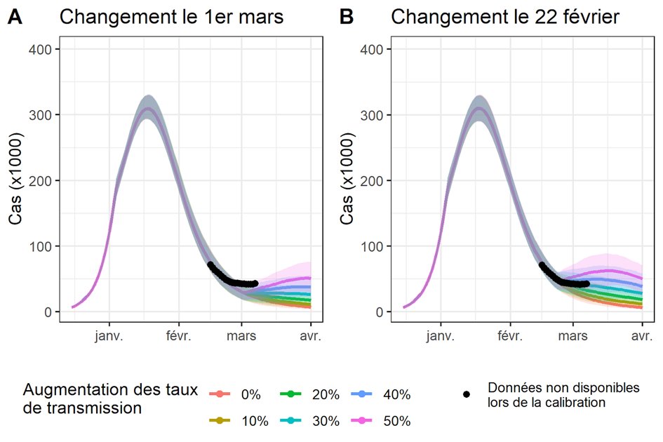 Nous faisions l’hypothèse que les Français augmenteraient leurs contacts le 1er mars, conduisant à un plateau début mars. Le plateau a été observé un peu plutôt et est compatible avec une augmentation des contacts le 22 février.