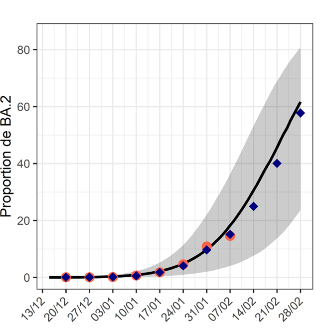 Publication d’un nouveau rapport où nous comparons les projections faites en février aux données récentes. Le modèle a bien anticipé la progression du sous-variant BA.2 modelisation-covid19.pasteur.fr/realtime-analy…