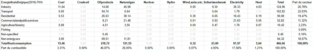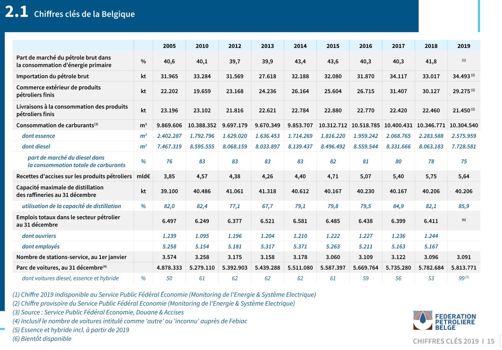 Nous le remarquons en analysant la consommation annuelle de carburants. En 2019, la Belgique a consommé 2576000m3 d'essence et 7728000m3 de diesel. Leur pouvoir calorifique (inférieur) est de respectivement 29MJ/L et 35MJ/L, on retrouve à peu de chose près les 95TWh.