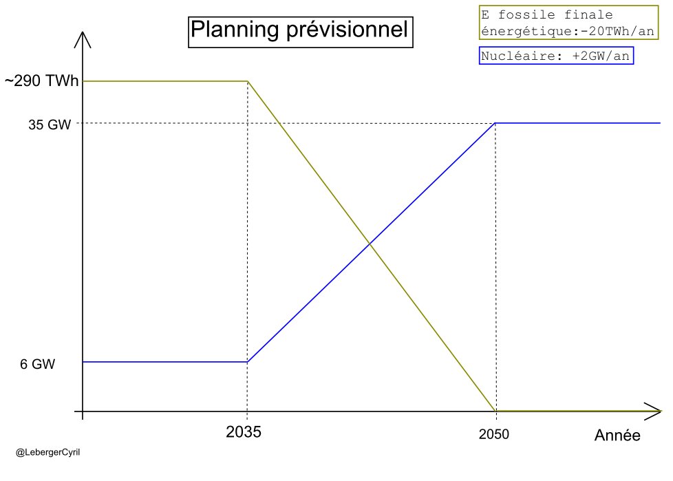 La construction des réacteurs se ferait en même temps que la société s'électrifie. La part d'énergie fossile se réduirait petit à petit. Les détails administratifs et la formation de différents corps de métier pourraient être réglés endéans les 8 ans.