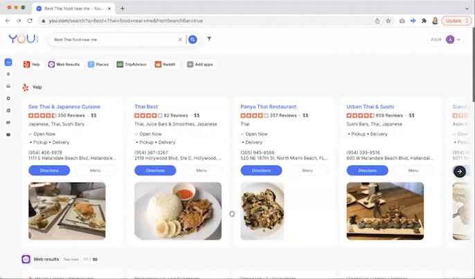 You probably want sth visual and not a large body of text. You'd want to see the restaurant name, rating, review, if they have delivery or pickup, photos of dishes, and the location and contact info. you.com/search?q=best+…